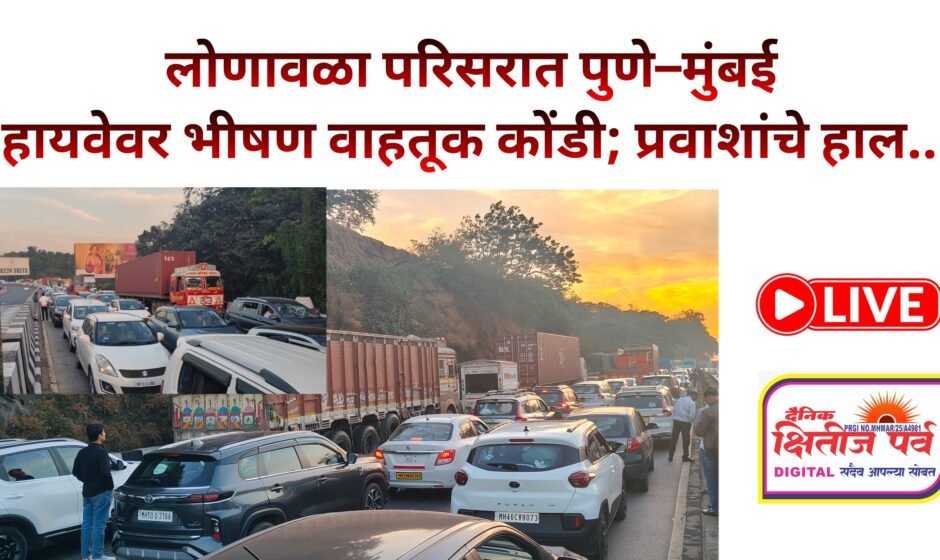 पुणे–मुंबई द्रुतगती मार्गावर लोणावळा परिसरात आज मोठ्या प्रमाणात वाहतूक कोंडी झाली. अचानक वाढलेली वाहनसंख्या, रस्त्यावरील संथगती वाहतूक आणि काही ठिकाणी बिघडलेली वाहने यामुळे हायवेवर लांबच लांब वाहनांच्या रांगा लागल्या. परिणामी जनतेची अक्षरशः तारांबळ उडाली.